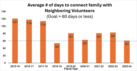 Our Bridge of Hope network of 21 locations across 13 states, has worked hard this past year to decrease the number of days it takes to “launch” a Neighborhood of Support for a family facing homelessness, from 83 to 61 days this past year (see graph). Without groups of 6-10 people from local churches, Bridge of Hope is unable to serve more families in need. The timing of these groups saying “yes” really matters to families facing homelessness!
